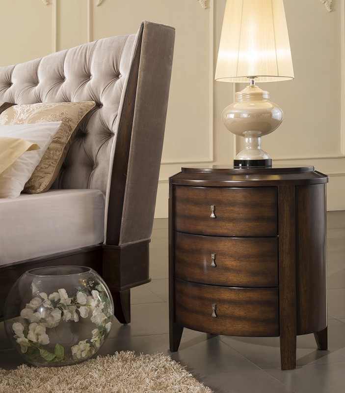 Прикроватная тумбочка с 3 выдвижными ящиками выполнена в стиле Неоклассика. Отделка шпон вишни, фронтальная часть в отделке сусальное серебро. Сделана из массива дерева и высококачественного МДФ высокой плотности.